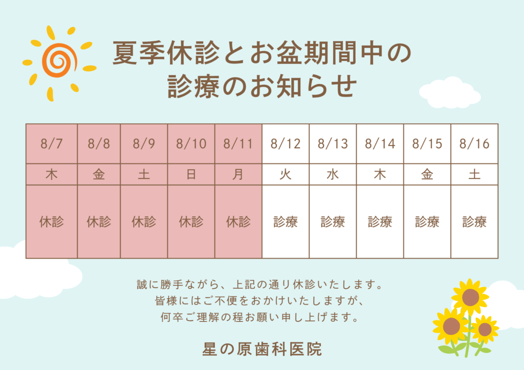なお、お盆期間中(8月12日〜8月16日)は通常通り診療いたします。